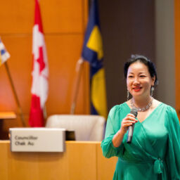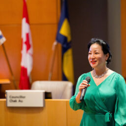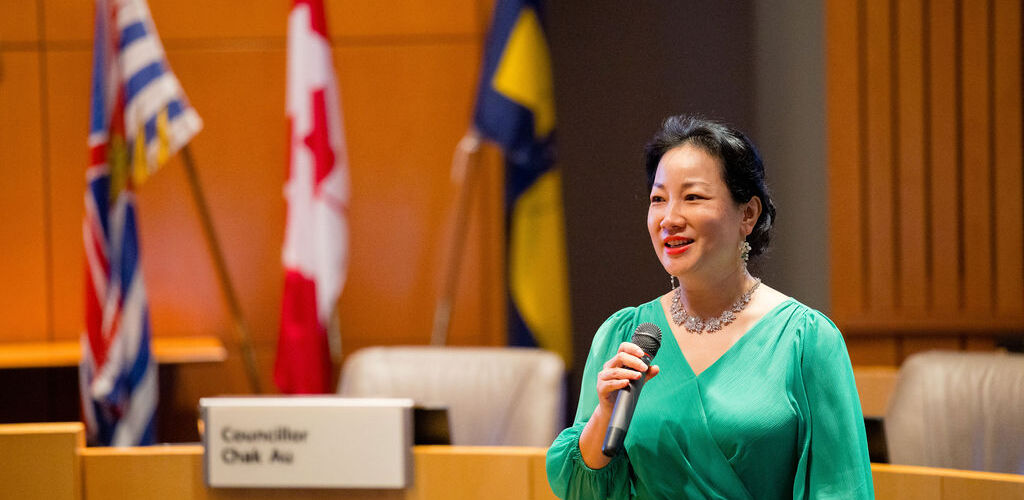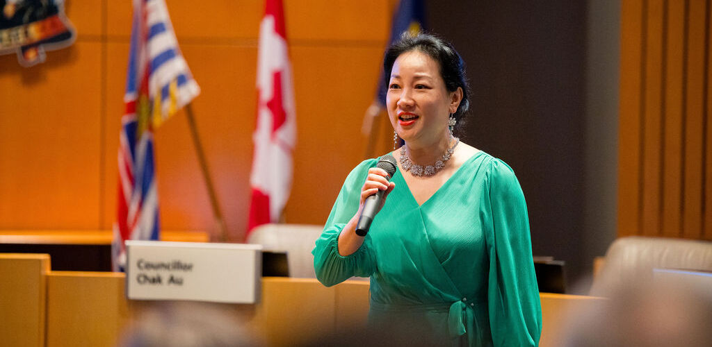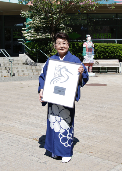 Left to right: Councillor Andy Hobbs, Councillor Bill McNulty, Peter Grant, Isidora Hoi-Ching Chan, Linda Shirley, Thomas Yu, Ceri Chong representing Tourism Richmond, Rita (Point) Kompst and Mayor Malcolm Brodie.