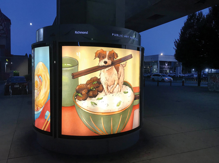 From now until January 31, Richmond’s Jani Kiu, Marina Szijarto and Monique Zhang will have works installed in the large, backlit display cases at the base of three concrete support columns at the stations. Jani Kiu’s mixed-media digital illustrations at Aberdeen Station are a playful take on Richmond’s vibrant food culture. Puns, cute animals and beloved dishes combine to highlight Richmond’s love of good food and drink. Marina Szijarto’s Intertidal Stilt Dance at Lansdowne Station, celebrates Richmond’s historic Finn Slough through the depiction of handcrafted stilt houses that honour lives shaped by tides, time and resourcefulness. Monique Zhang’s Blue Cocoon paintings, also at Lansdowne Station, capture early morning moments among family members that celebrate love, care and connection in the quiet rhythm of daily life in our diverse city.